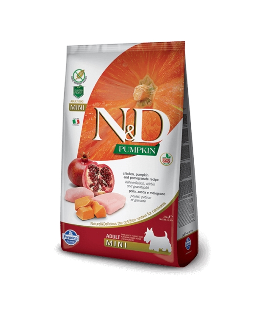 Alimento naturale per cani adulti di taglia piccola, a base di carne di agnello, zucca e mirtillo. La linea Farmina Natural & Delicious Pumpkin è basata sulla formula: 70% ingredienti di origine animale, 30% sostanze vegetali e minerali, 0% cereali.