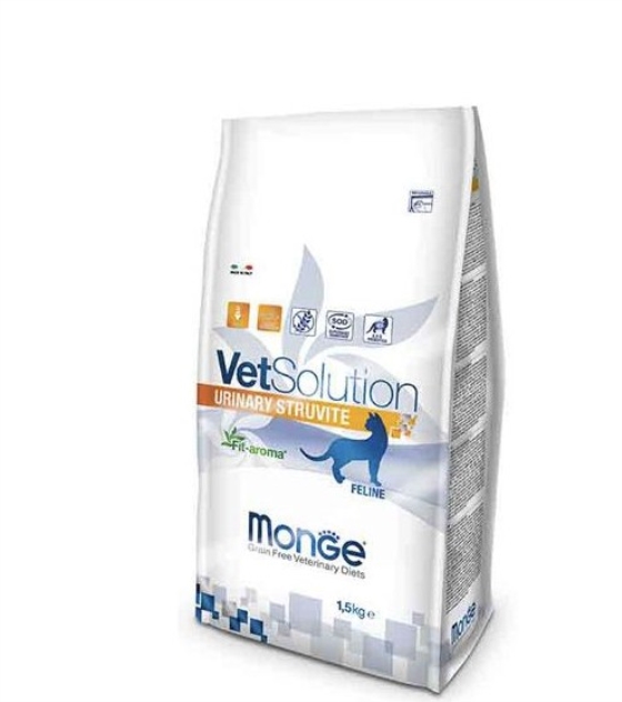 Monge VetSolution Urinary Struvite Feline è un alimento dietetico completo per gatti formulato per la dissoluzione di calcoli a base distruvite, per la riduzione delle recidive dei calcoli di struvite e per la sindrome urologica dei felini, FUS. Contiene concentrato di succo di melone per neutralizzare i radicali liberi, mirtillo rosso per il supporto urinario e Xilo-oligosaccaridi (XOS) per preservare il microbiota intestinale. La formulazione è caratterizzata da proprietà acidificanti dell’urina e bassa concentrazione di magnesio.